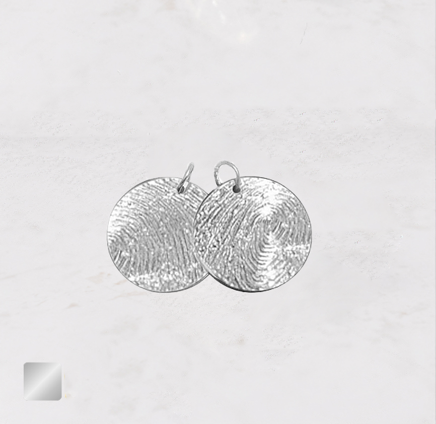 Een bijzondere set van twee ronde hangers van elk 18 mm, vervaardigd uit 925 sterling zilver. In elke hanger wordt met grote precisie een vingerafdruk gegraveerd – bijvoorbeeld van twee geliefden, ouder en kind, of ter nagedachtenis aan twee dierbaren.