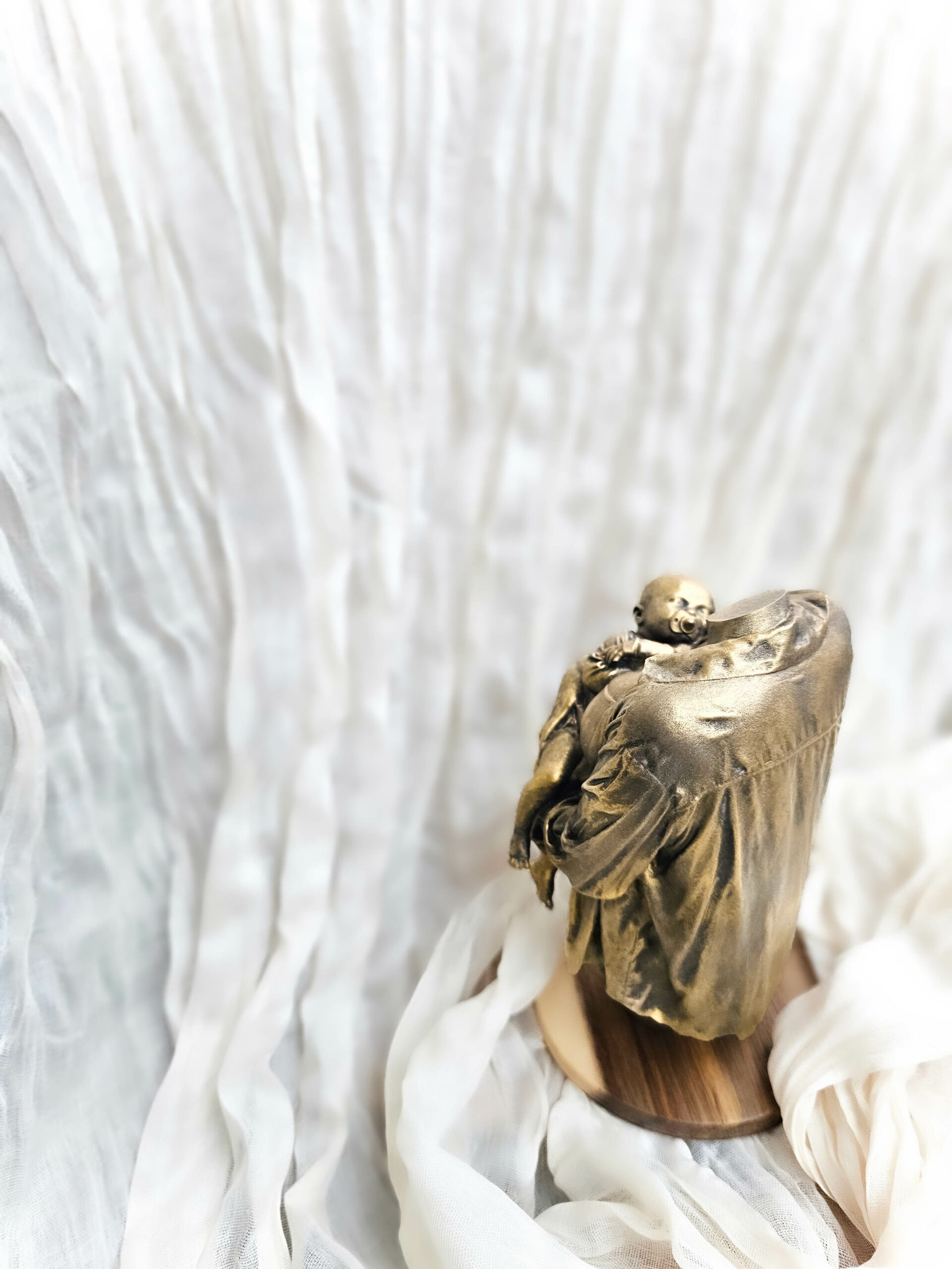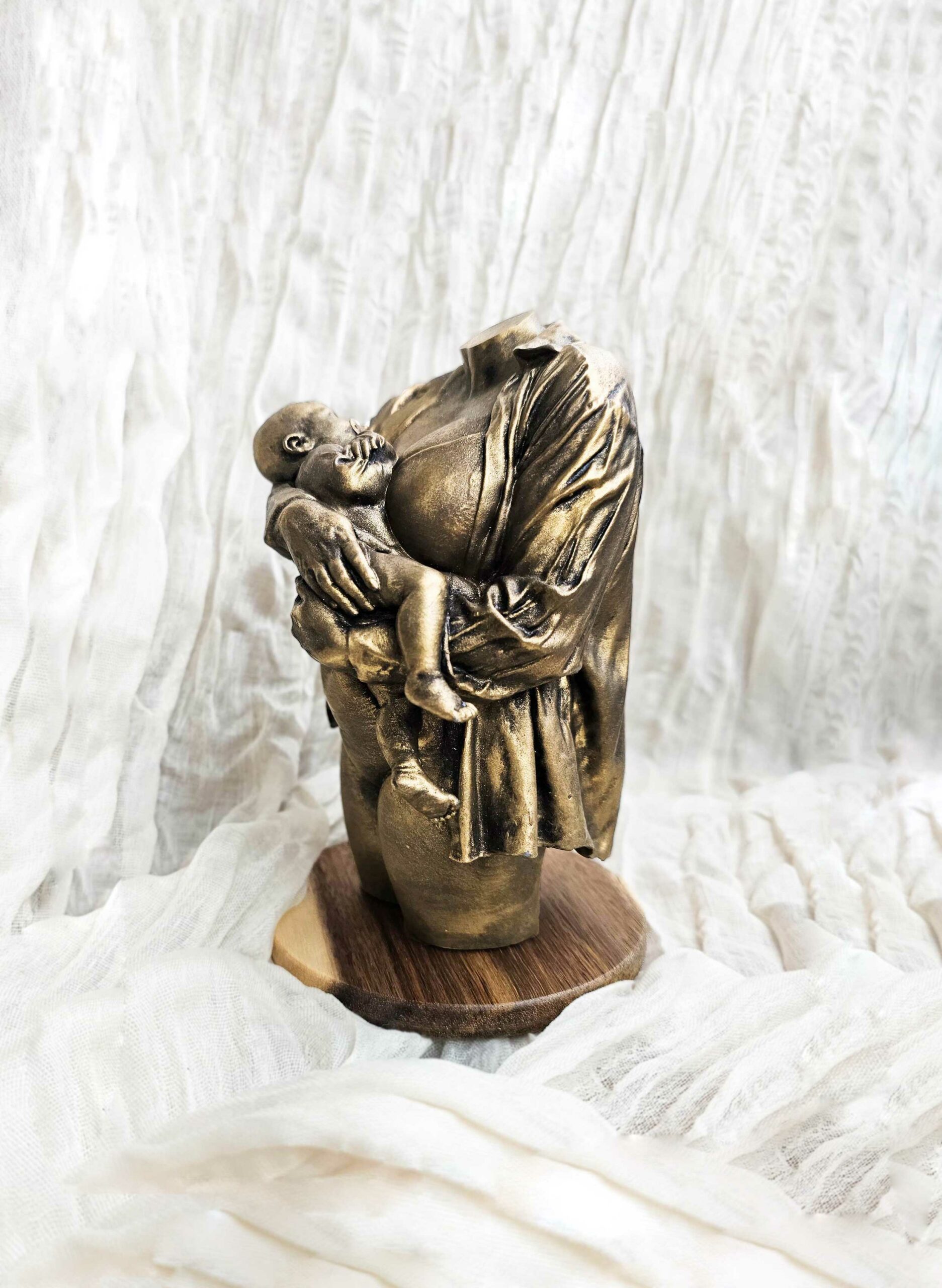 Het vastleggen van dit kunstwerk is meer dan alleen een foto of sculptuur; het is het vangen van een emotie, een herinnering die blijft bestaan. De zachte rondingen, de subtiele details en de harmonie tussen de twee figuren zorgen ervoor dat de diepe band tastbaar wordt. Dit beeld is een eerbetoon aan de kracht en schoonheid van moederliefde, een blijvende herinnering aan de meest kostbare momenten samen.
