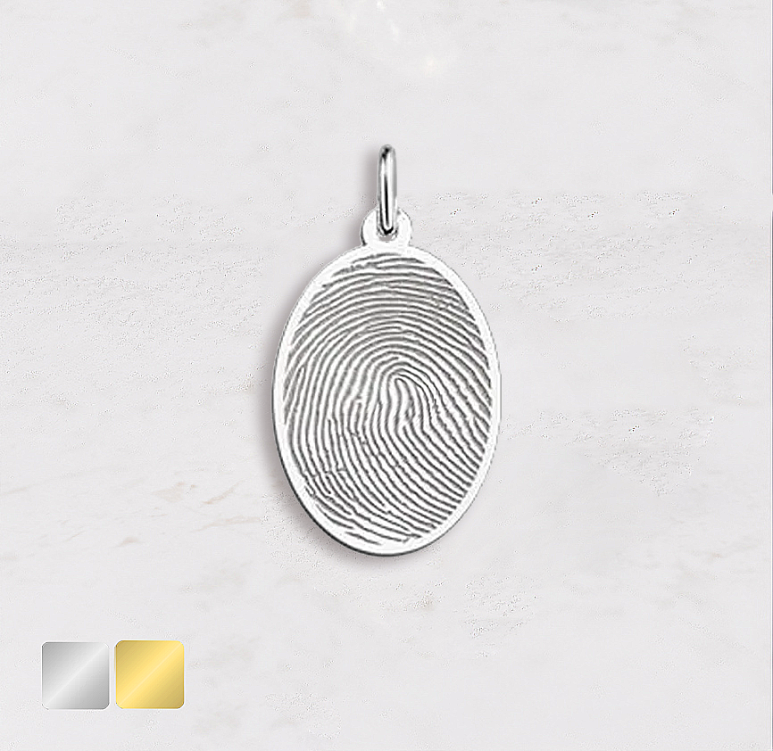 Draag een blijvende herinnering dichtbij met deze elegante ovale hanger, waarin een vingerafdruk met zorg wordt gegraveerd. De hanger is vervaardigd uit hoogwaardig 925 zilver en meet  24,5 x 16 mm.