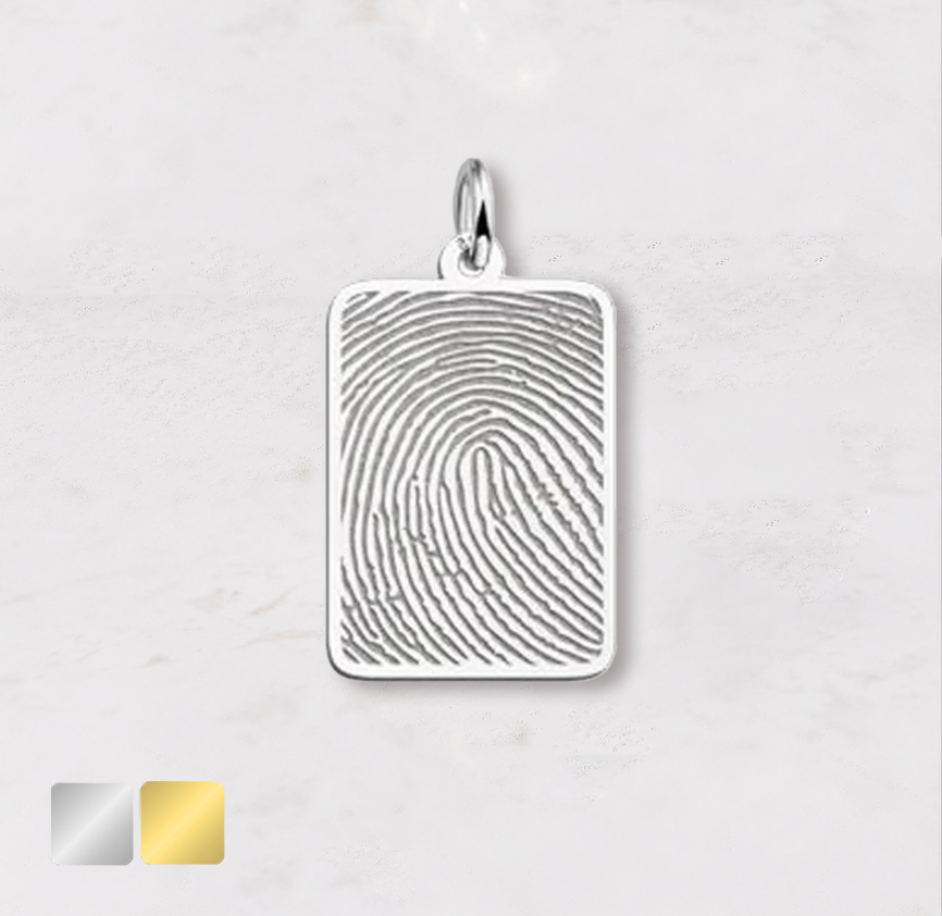 Draag een blijvende herinnering dichtbij met deze stoere hanger, waarin een vingerafdruk met zorg wordt gegraveerd. De hanger is vervaardigd uit hoogwaardig 925 zilver en meet  25,5 x 15,5 mm.