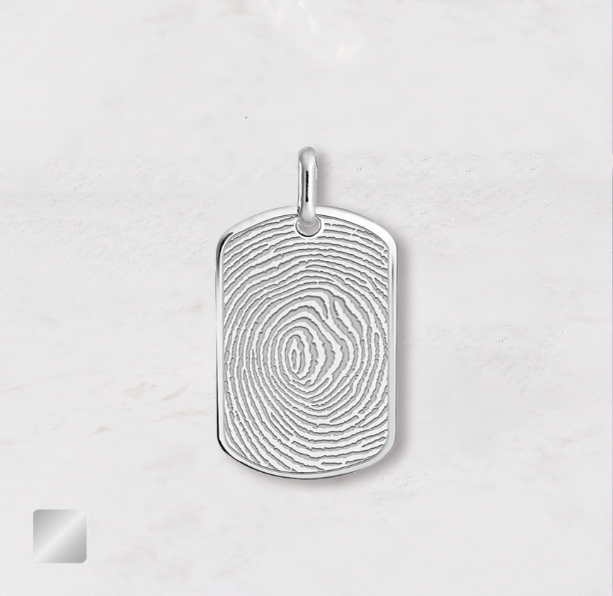 Draag de herinnering aan jouw dierbare altijd bij je met deze robuuste ID-hanger, waarin een vingerafdruk subtiel is verwerkt. De hanger meet 20×30 mm en is uitgevoerd in een krachtig, strak design dat zowel stijlvol als persoonlijk is.